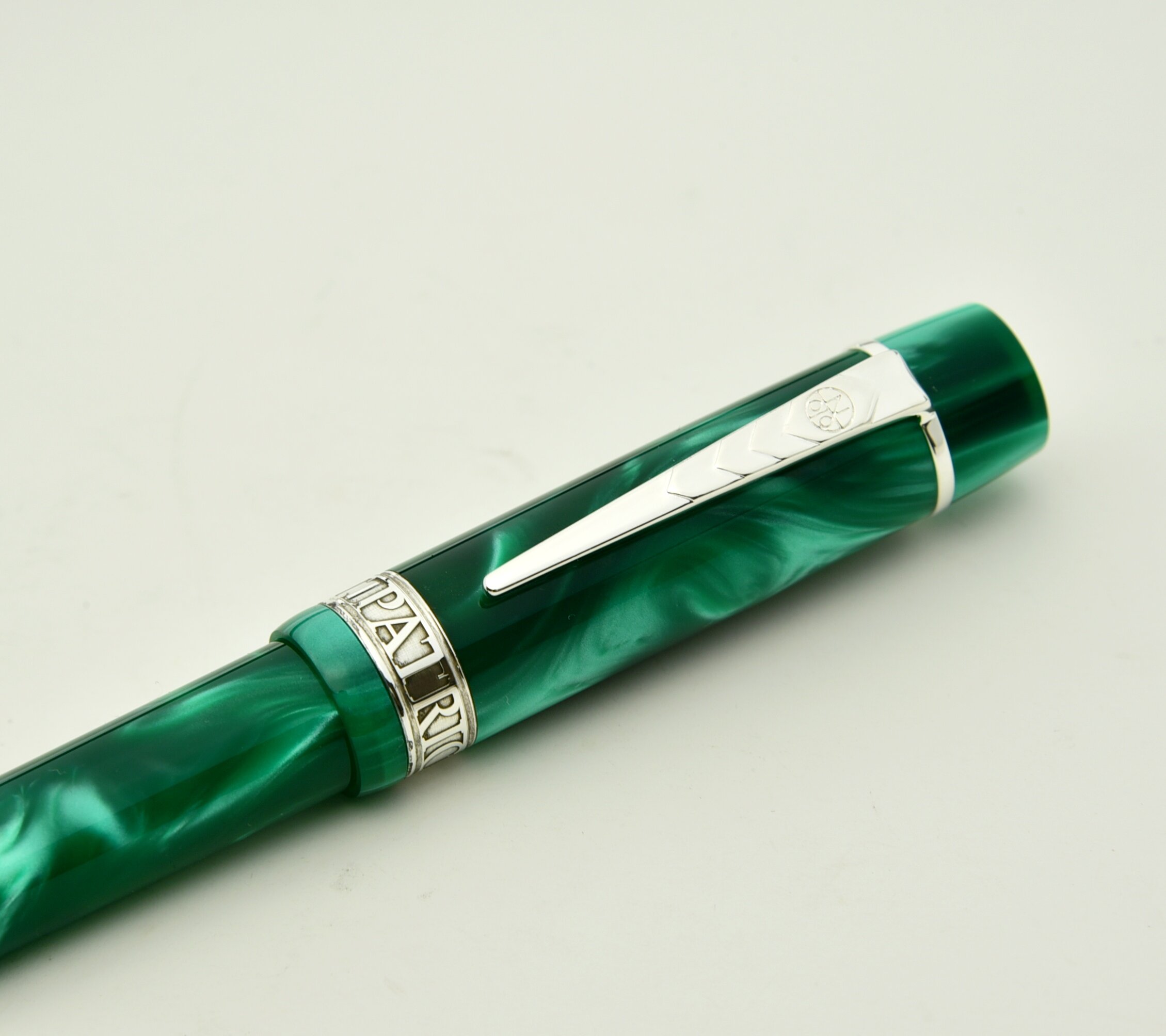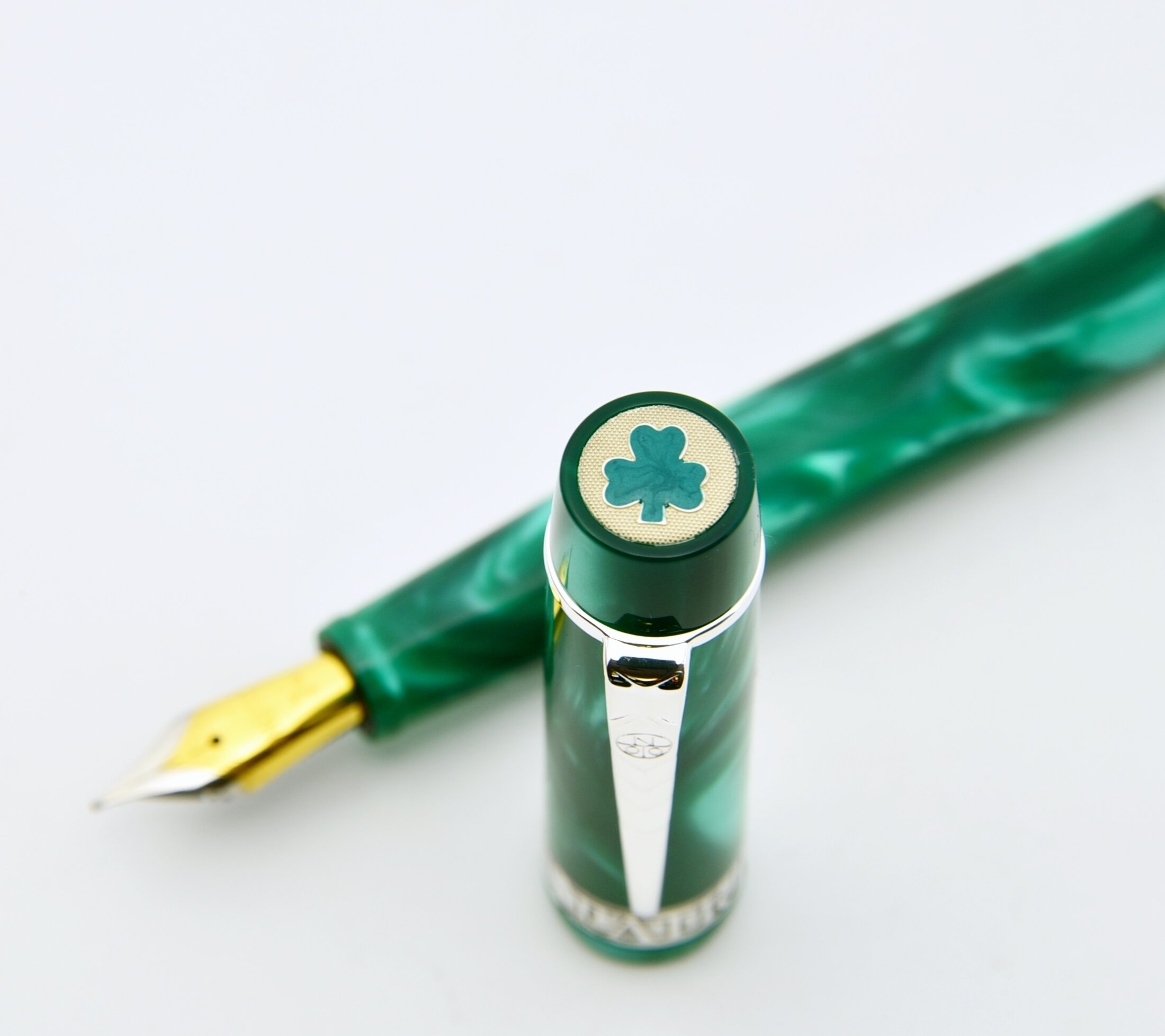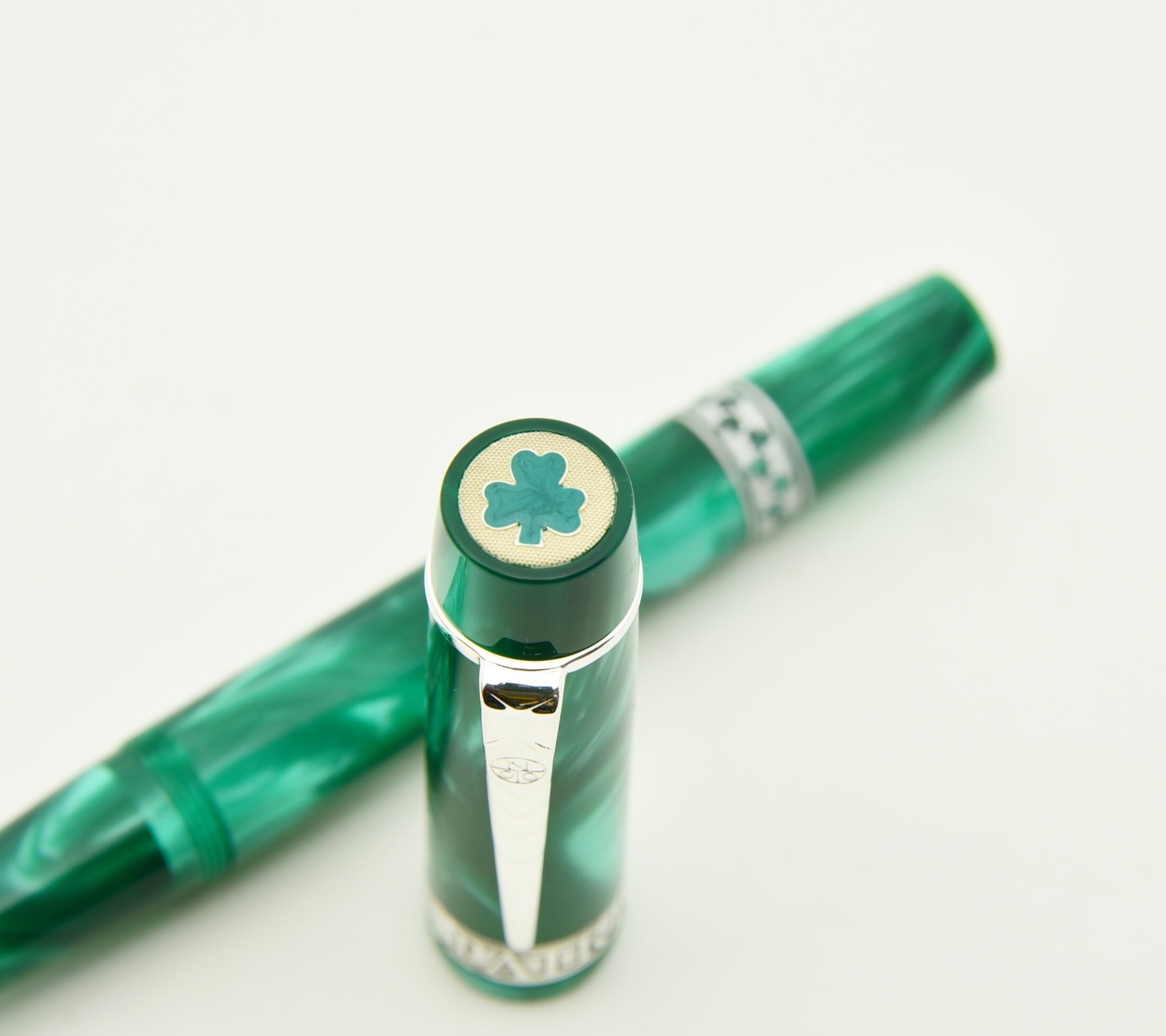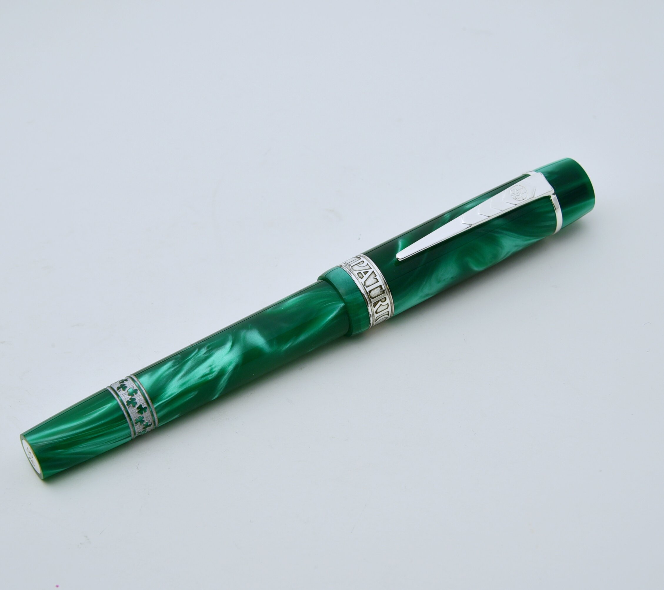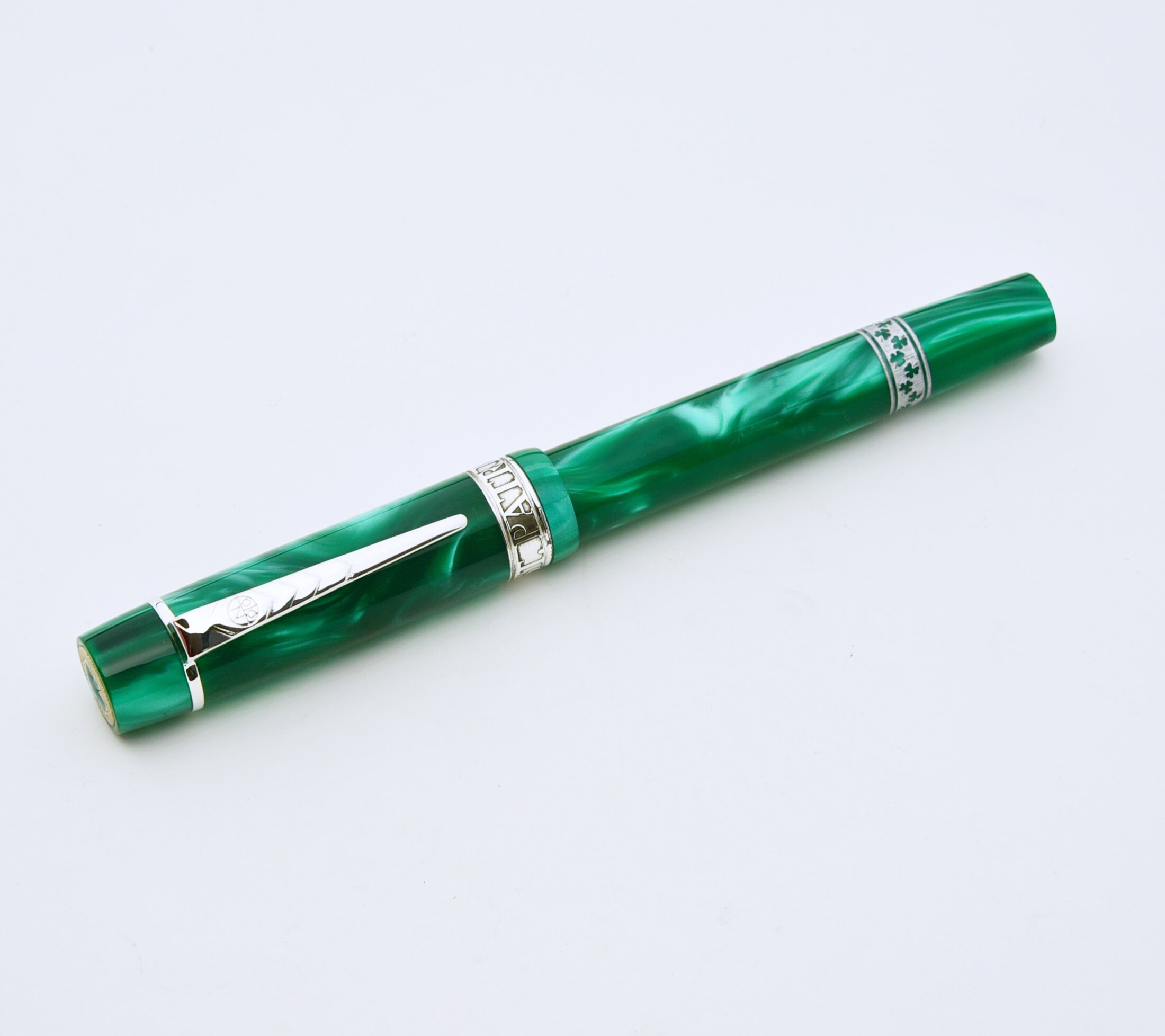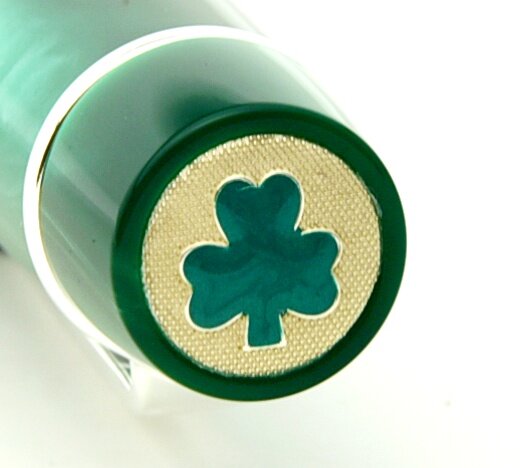 The pen features a finely detailed sterling silver cap button engraved with a delicate shamrock motif which is meticulously hand-filled with rich green by skilled artisans.