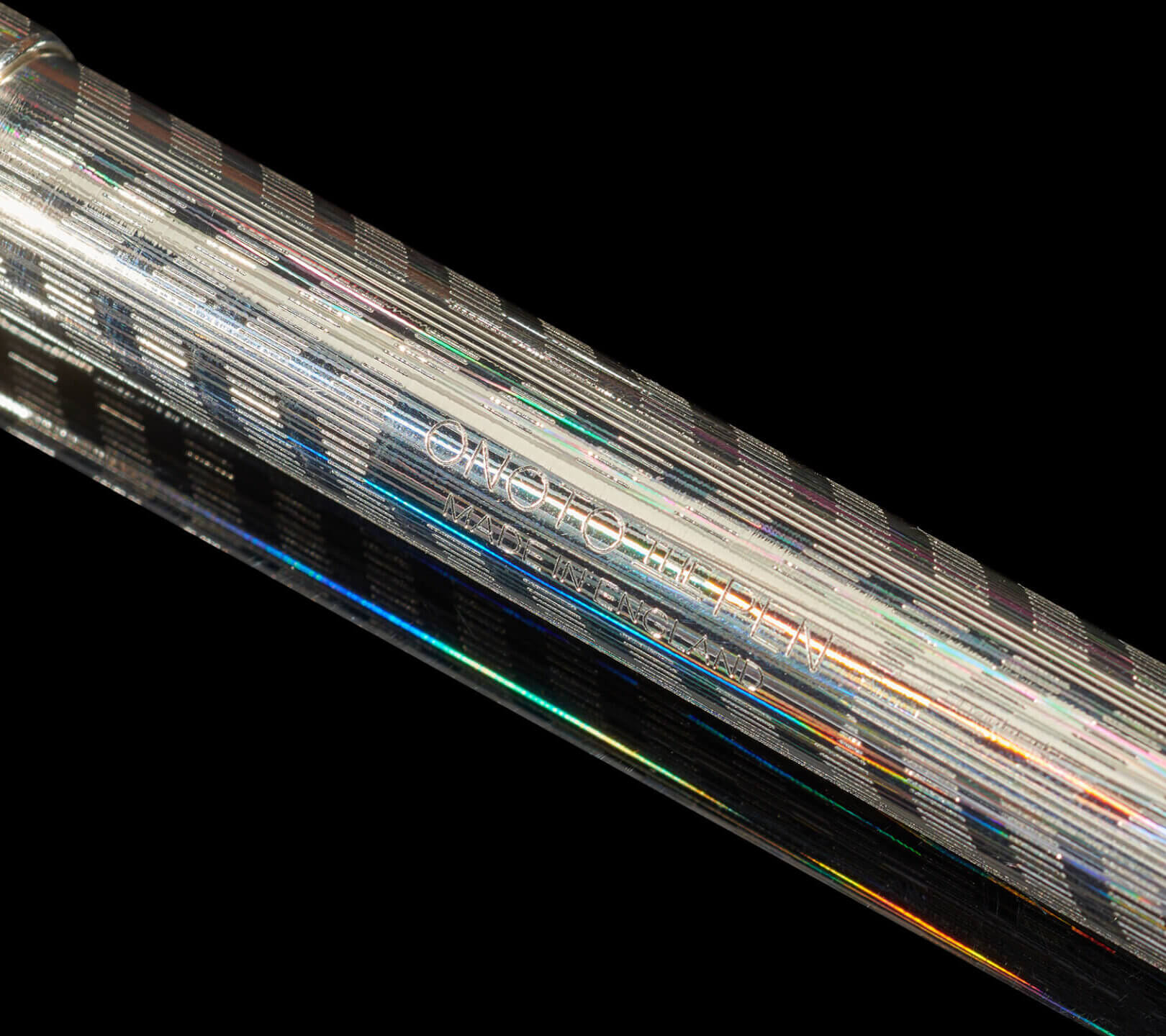 The barrel is diamond-cut with a sharp chevron pattern, a contemporary echo of traditional Onoto precision engine turning patterns. Along the barrel, the classic ONOTO THE PEN – MADE IN ENGLAND engraving is set with precision, anchoring the piece firmly in the heritage context.
