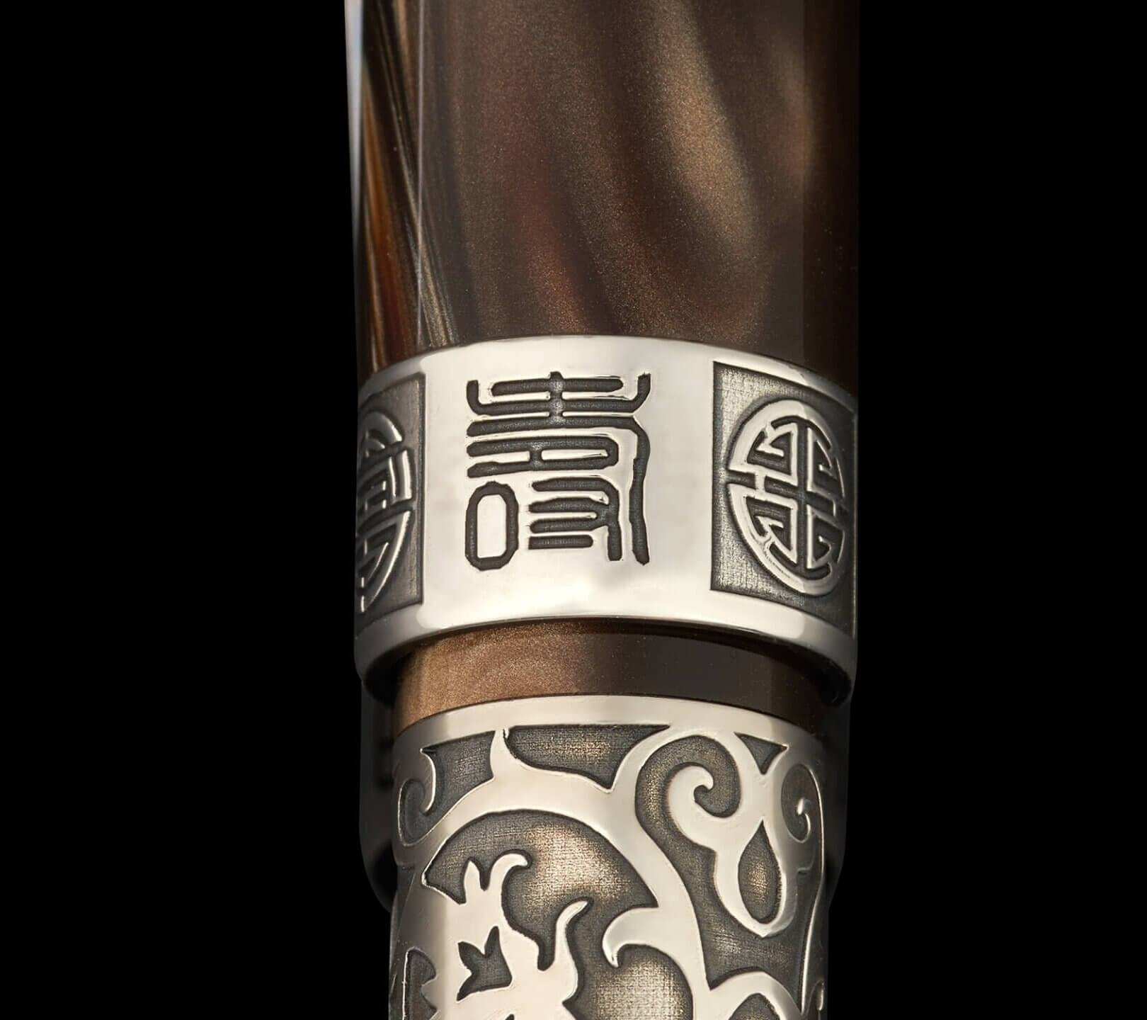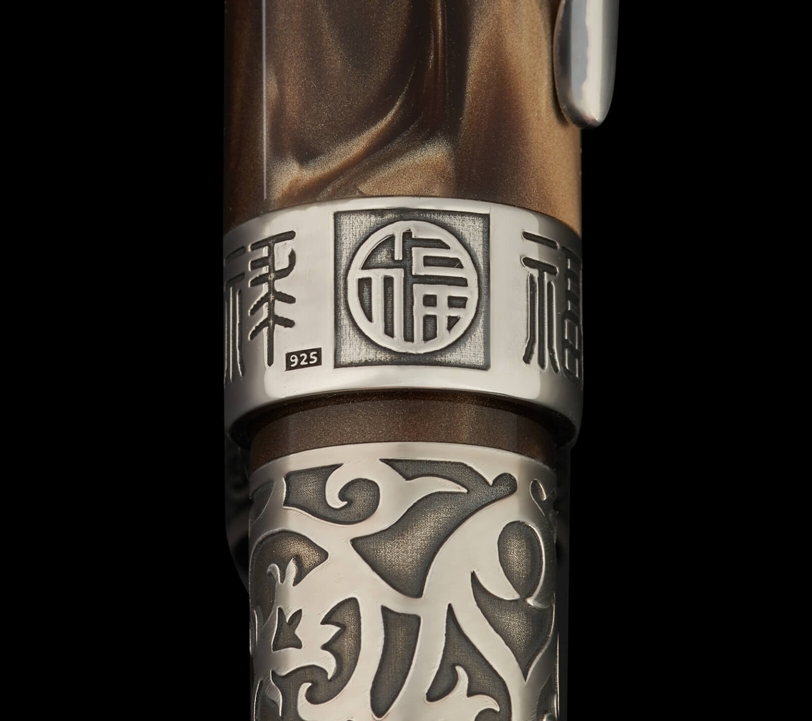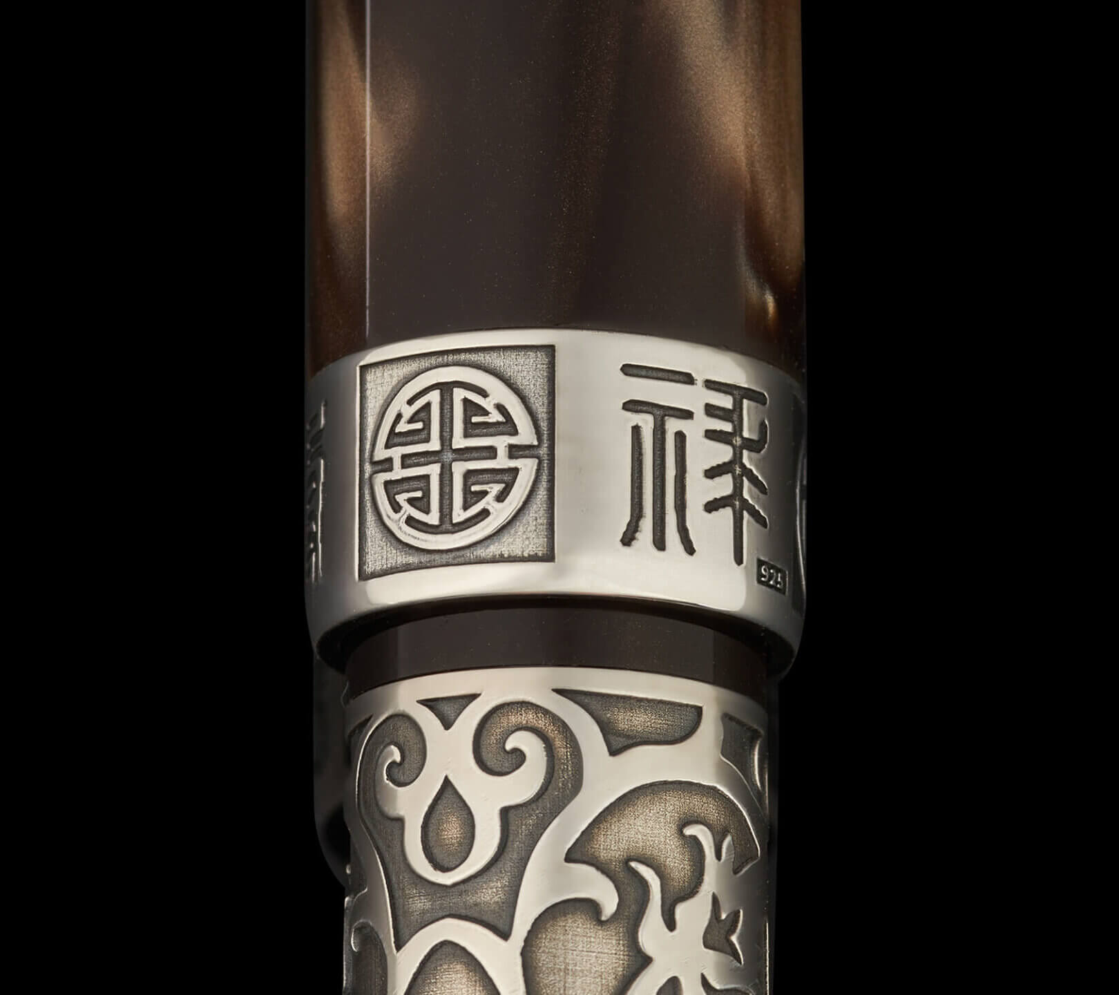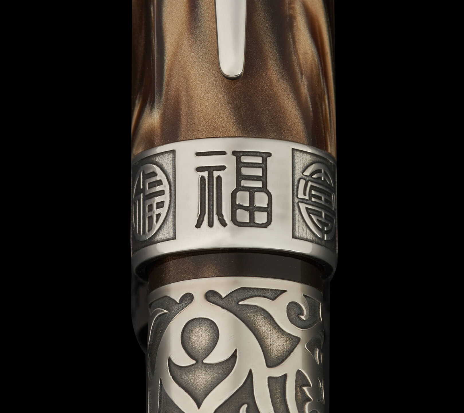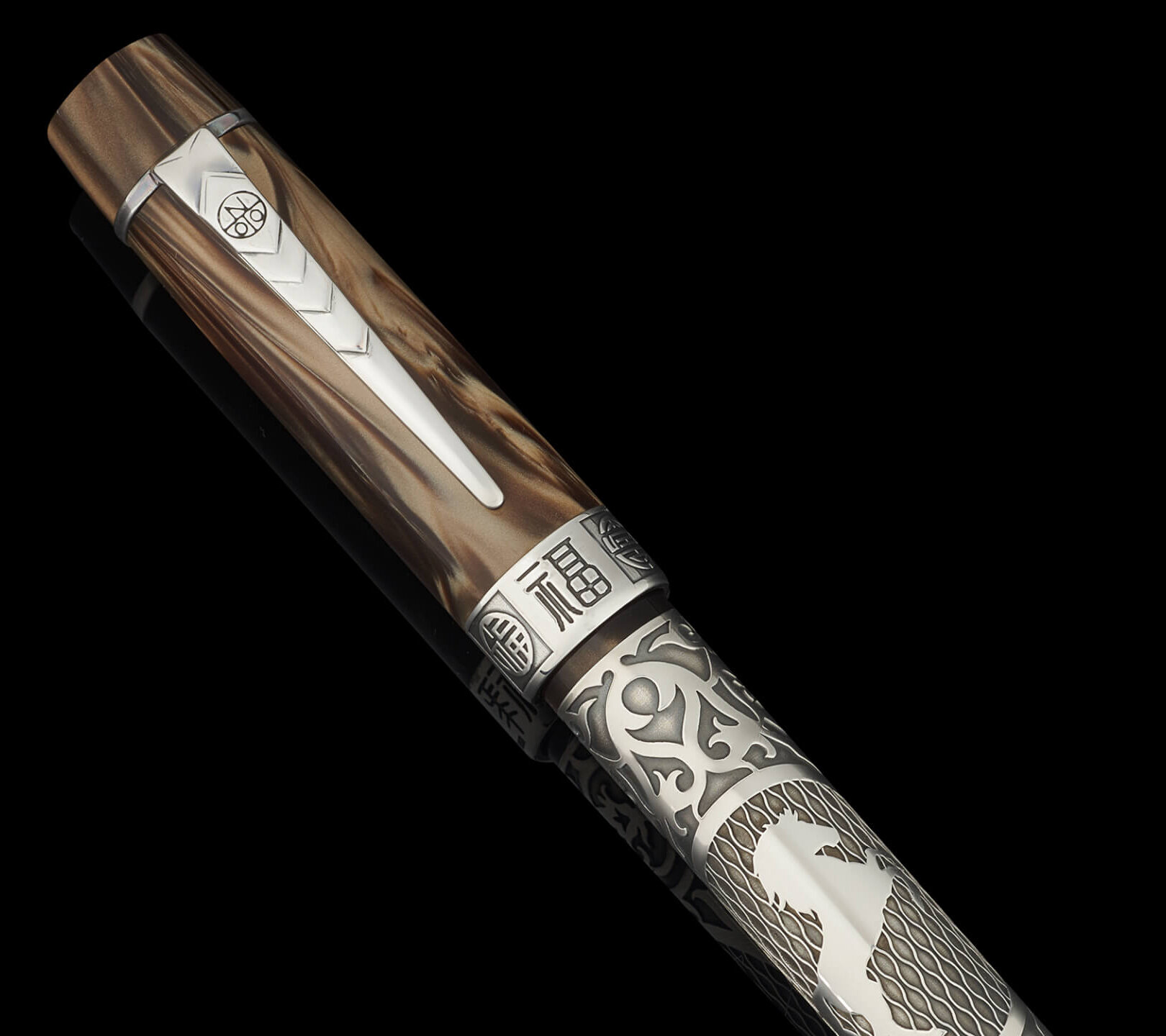 The cap band carries Onoto’s traditional zodiac engravings Fu (福), Lu (禄) and Shou (寿), treated with the same restrained oxidation to maintain visual harmony. The solid silver cap button is engraved with a flying horse motif, subtly inspired by ancient Chinese bronze sculpture, offering a quiet reference to motion and vitality.