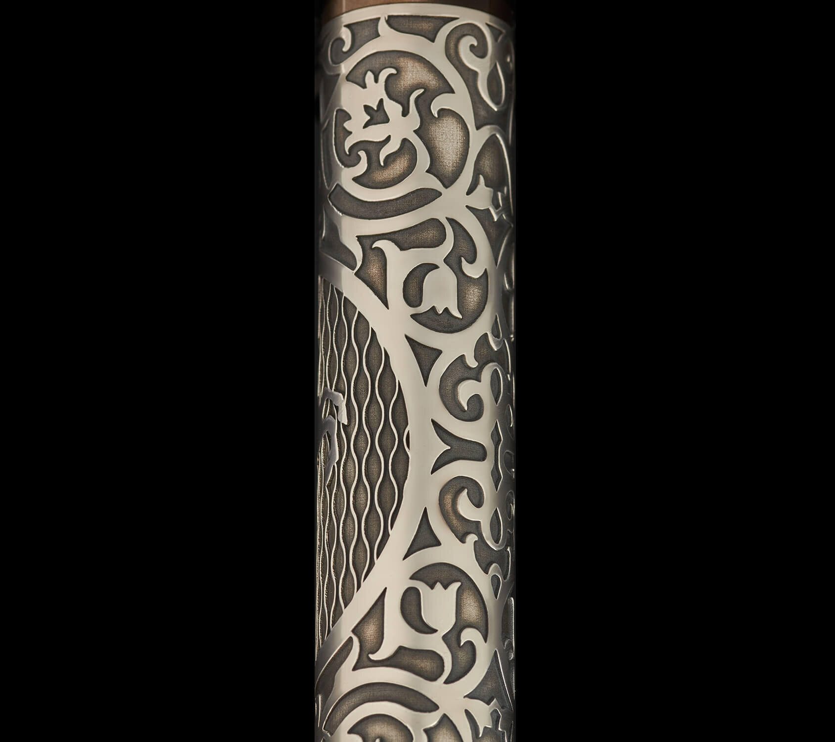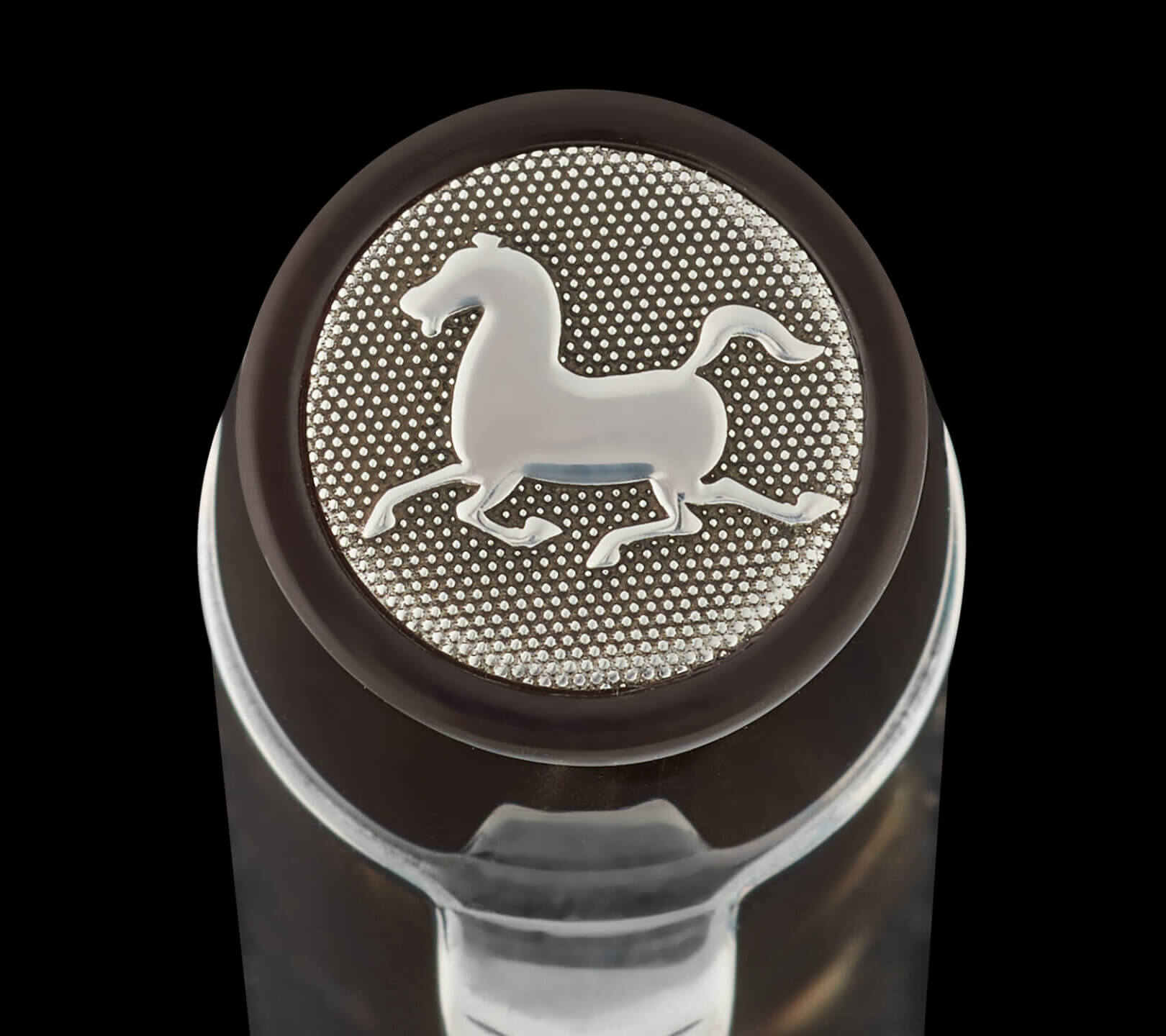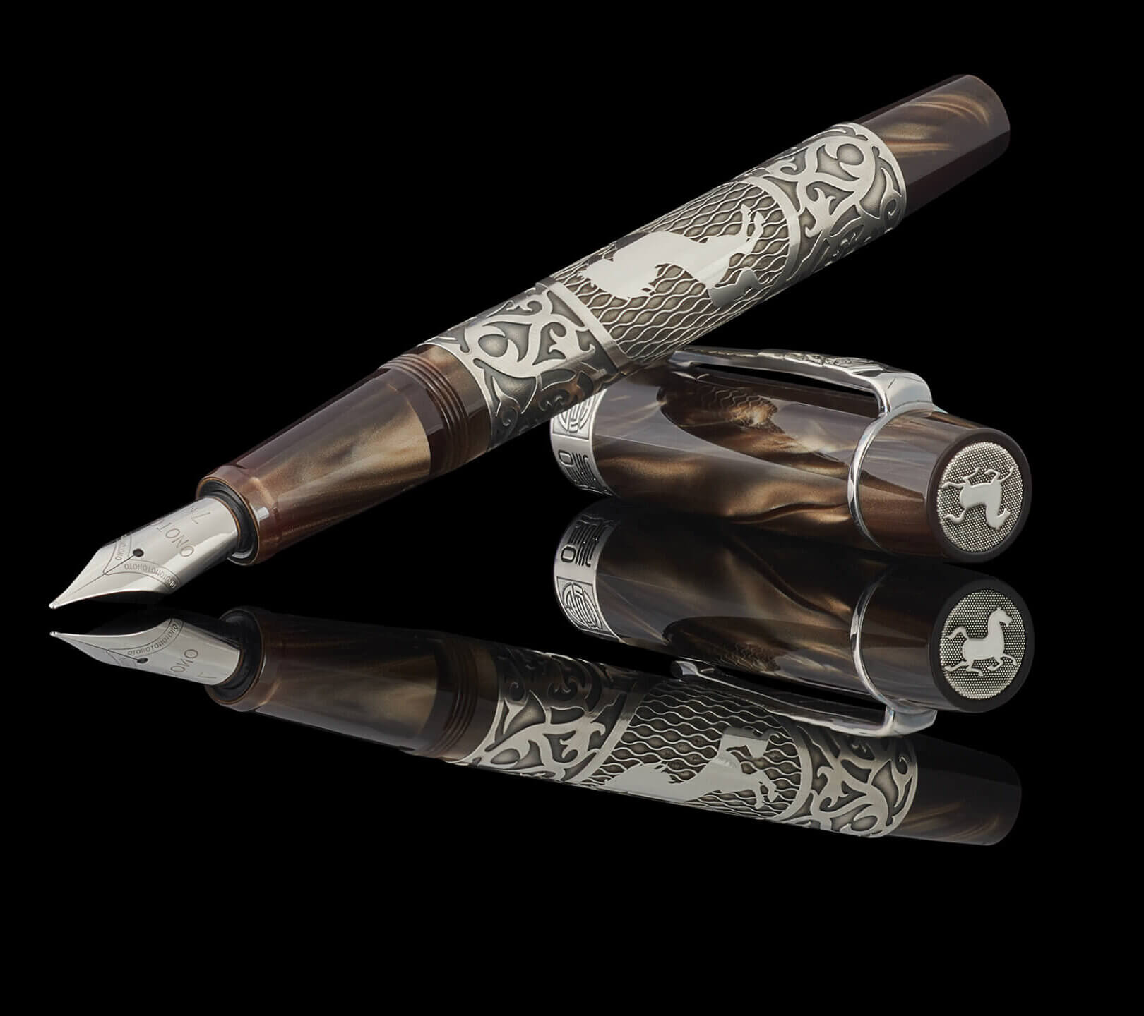 At the heart of the barrel, a circular medallion presents a leaping horse in relief, set against Onoto’s signature chased pattern. The sterling silver surfaces are subtly oxidised, lending a refined dark tone that enhances the depth of each engraving, while careful polishing brings out luminous highlights, creating a dynamic play of light and shadow across the form.