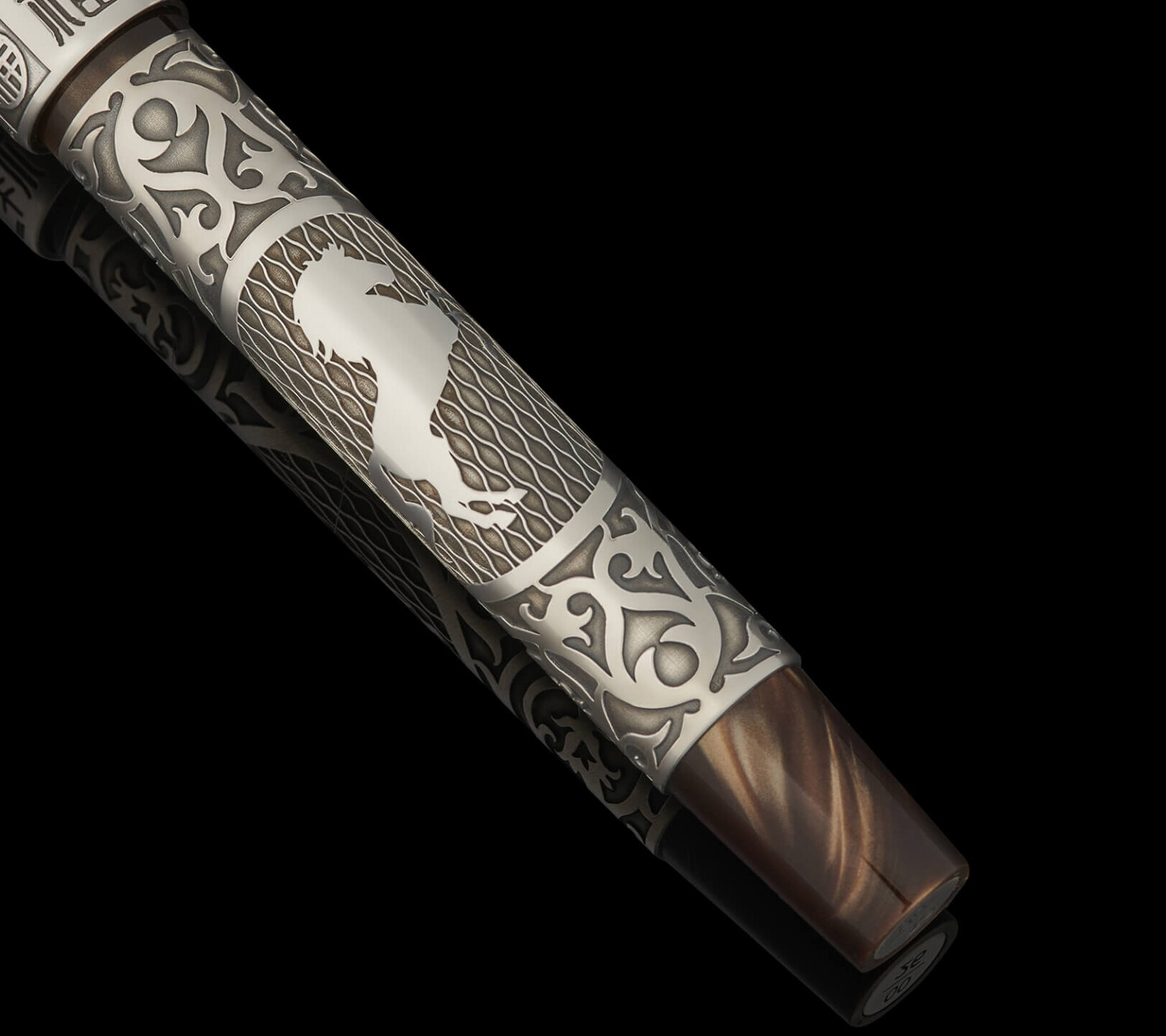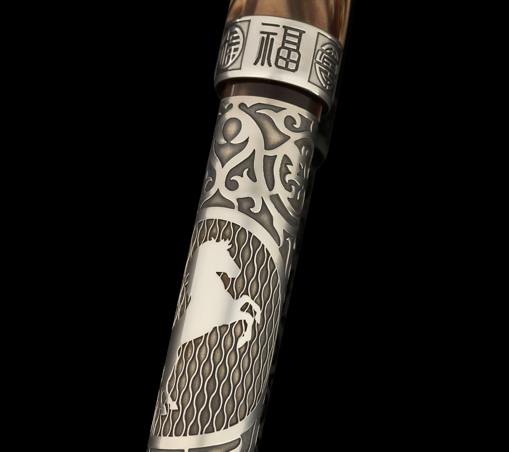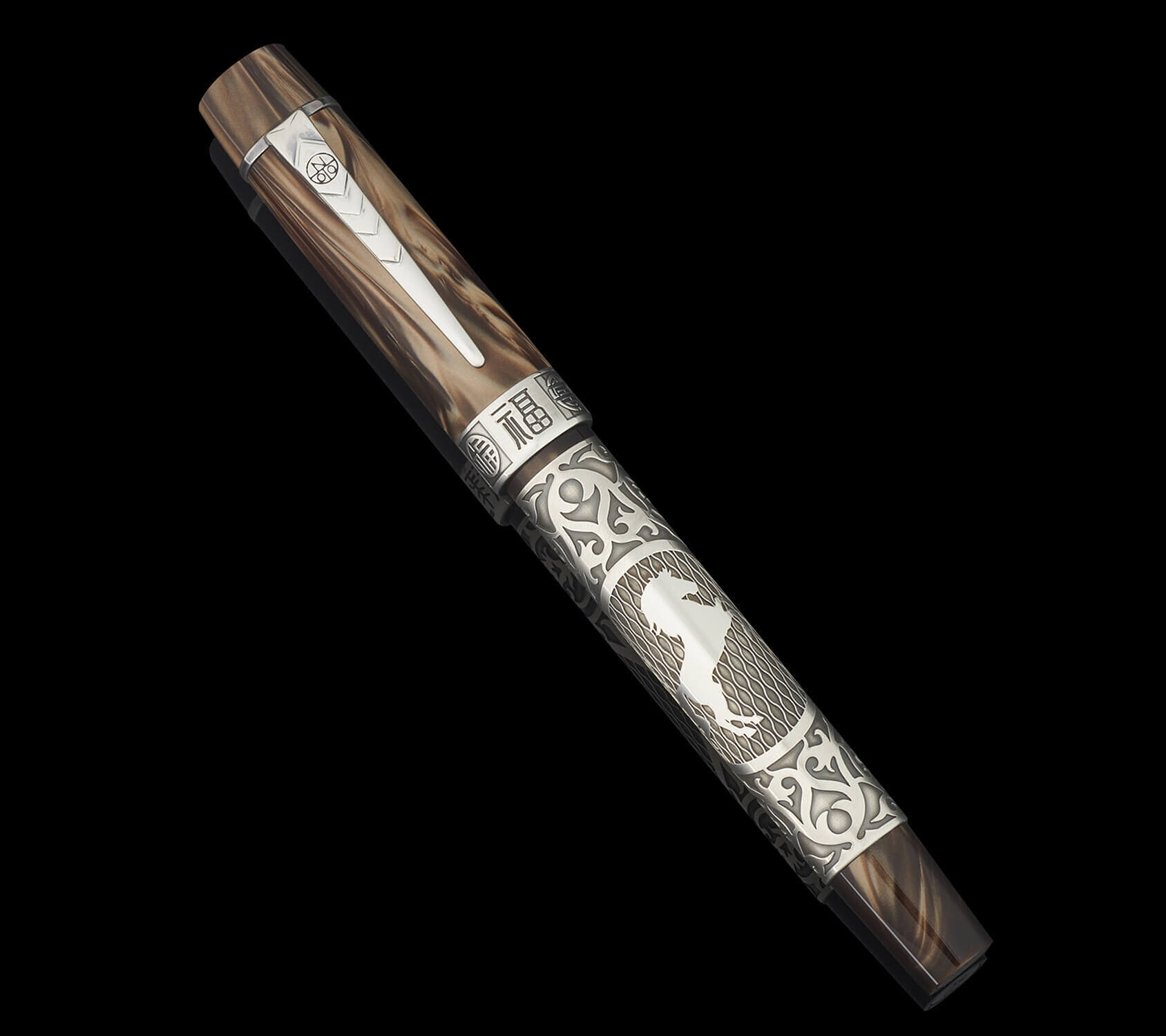 The Victory Horse Pen offers a more intricate interpretation within the Year of the Horse collection, placing emphasis on carved surface details. Deeply engraved sterling silver shapes the character of the barrel, complemented by restrained pearlescent chestnut-brown acrylic accents at the finial and nib section.